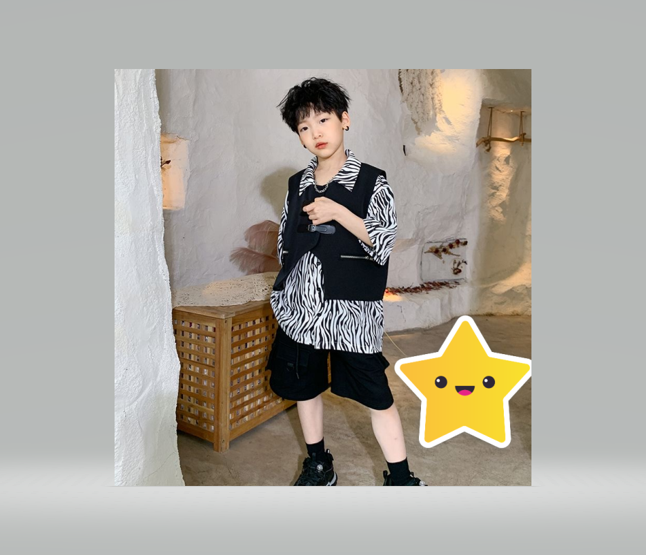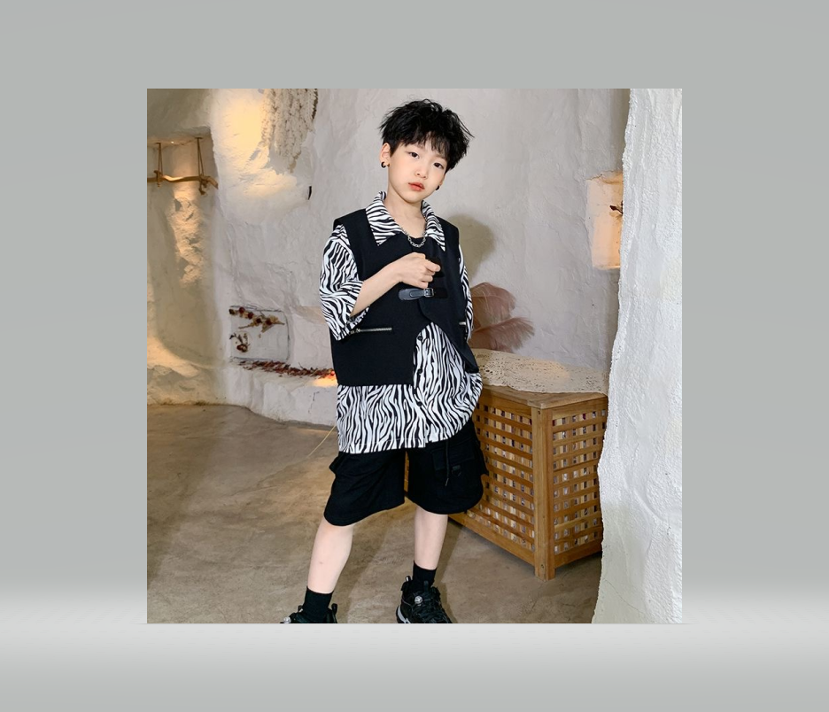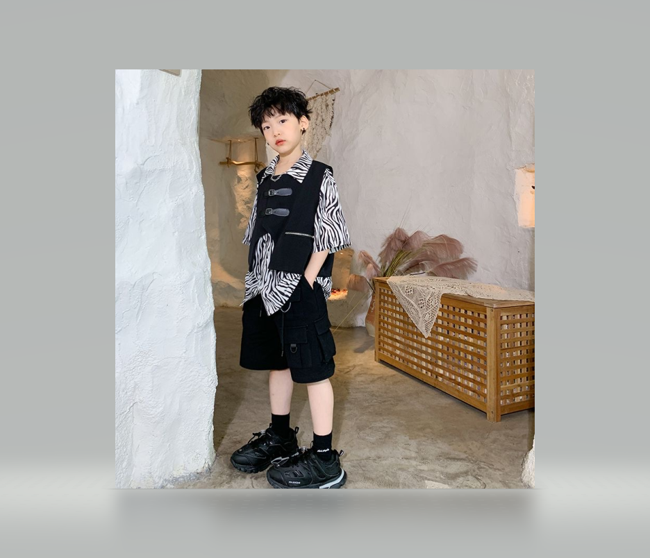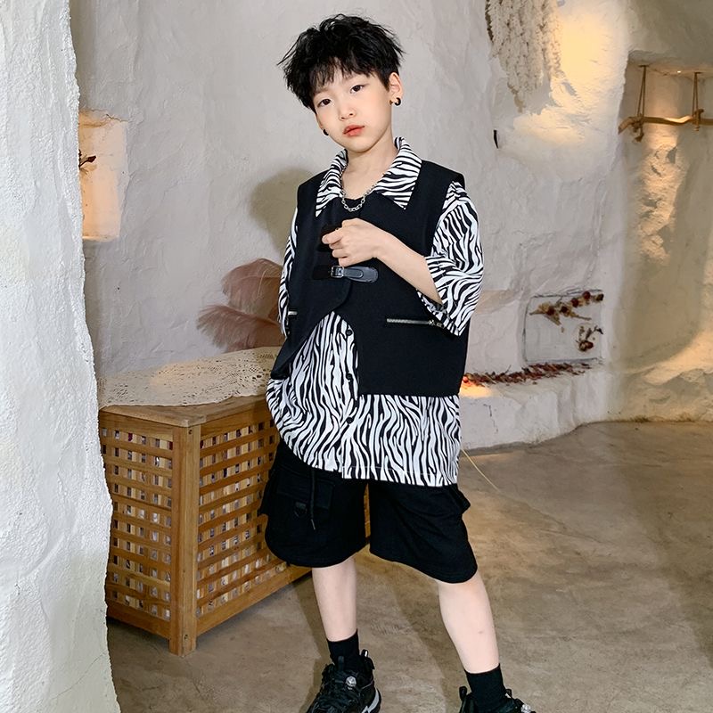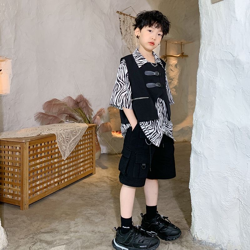 Three-piece black suit leather buckle waistcoat boy's new summer function wind big child street dance children's cargo tide