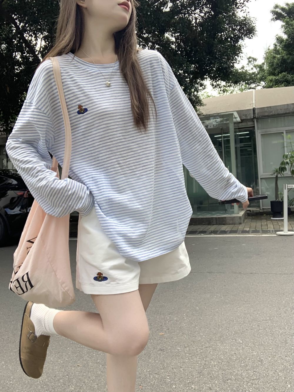 Summer French fashion casual suit women's color contrast striped T-shirt heavy embroidery straight shorts two-piece set
