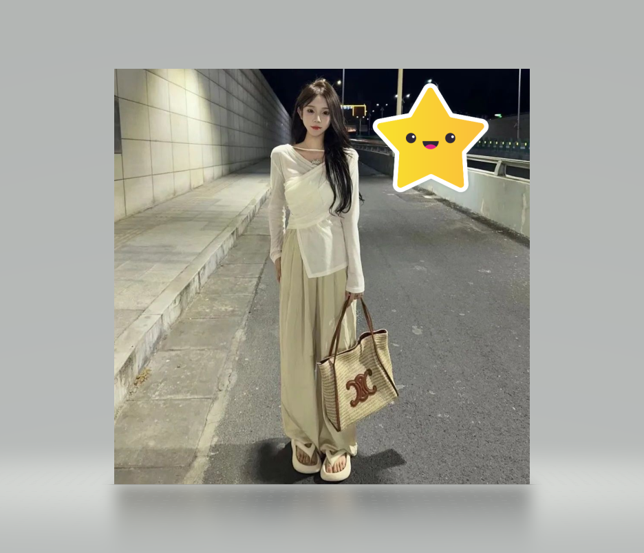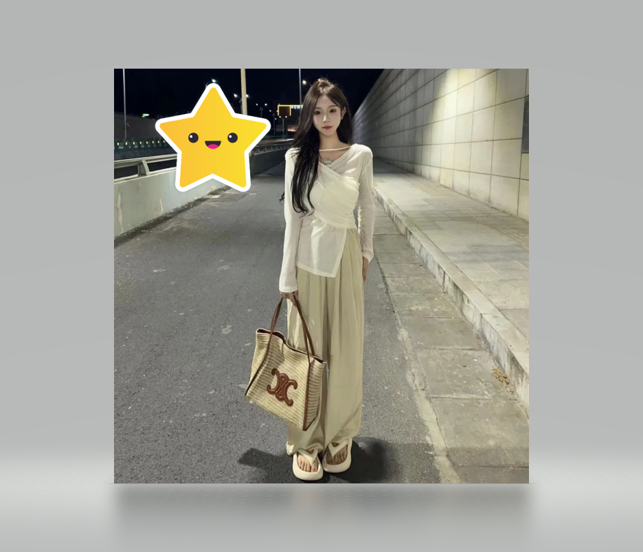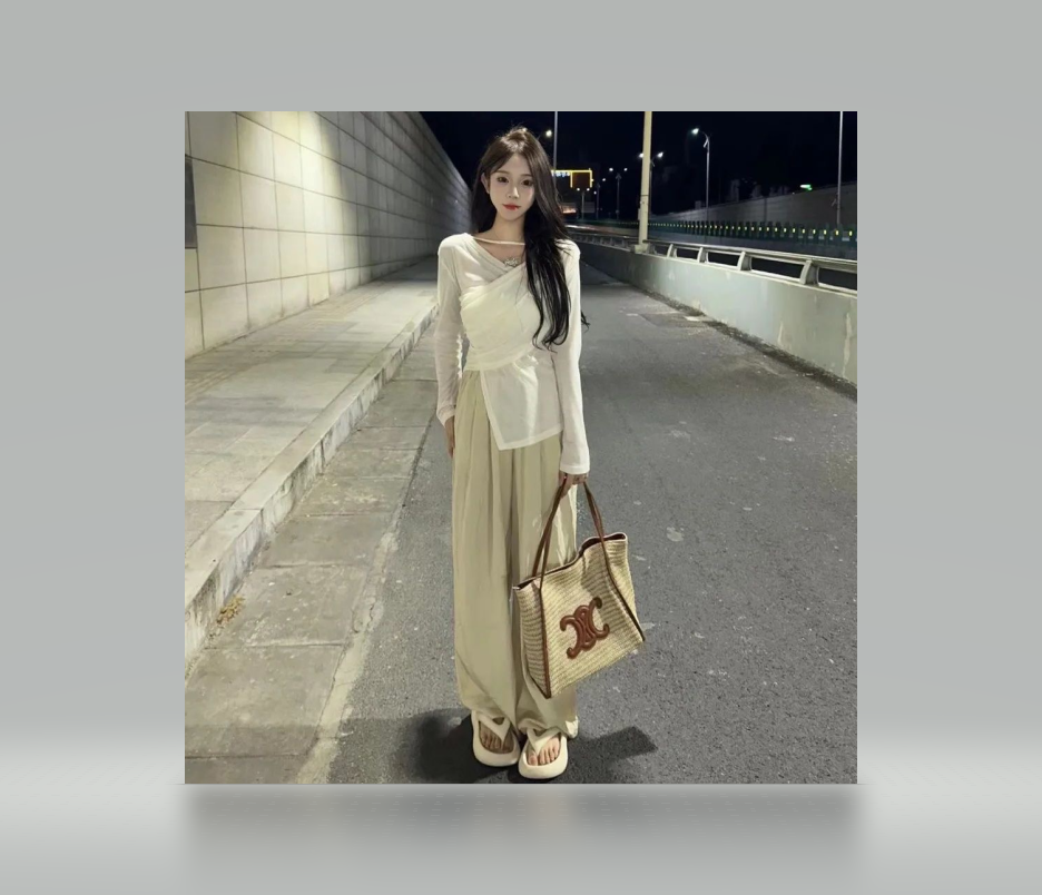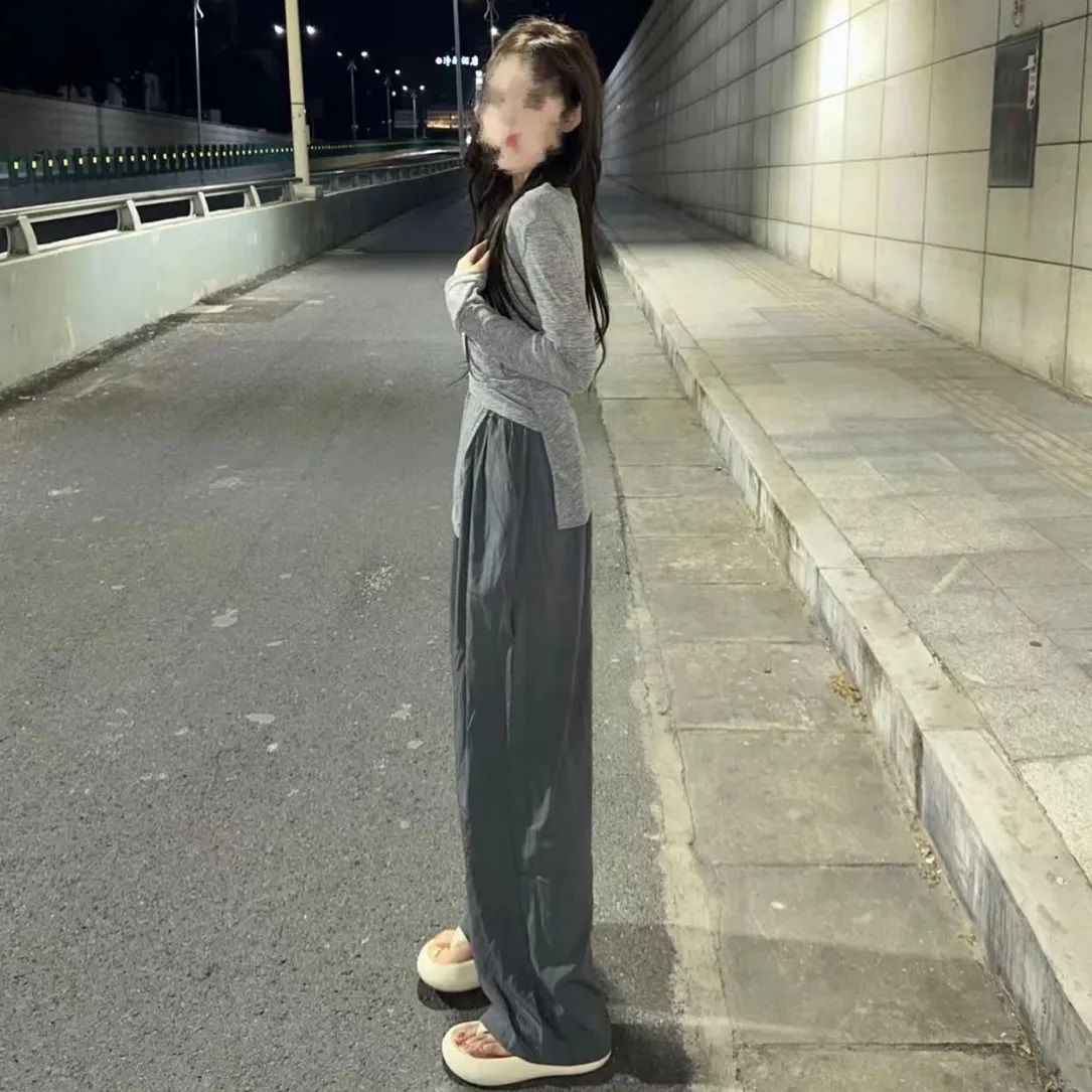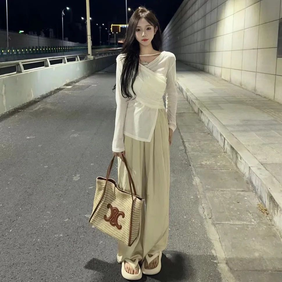 The same irregularly split long-sleeved shirt high waist wide leg drop trouser suit