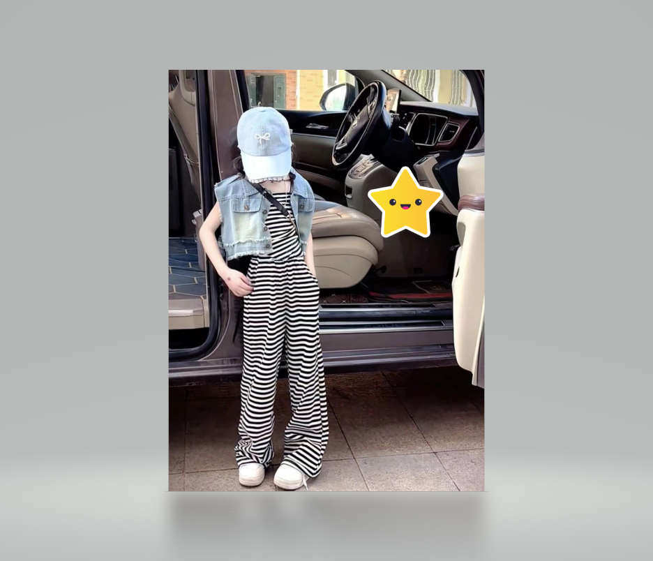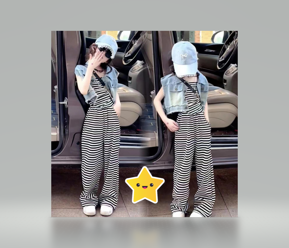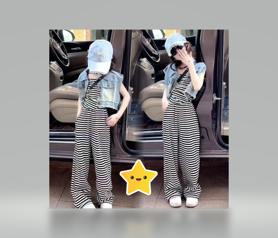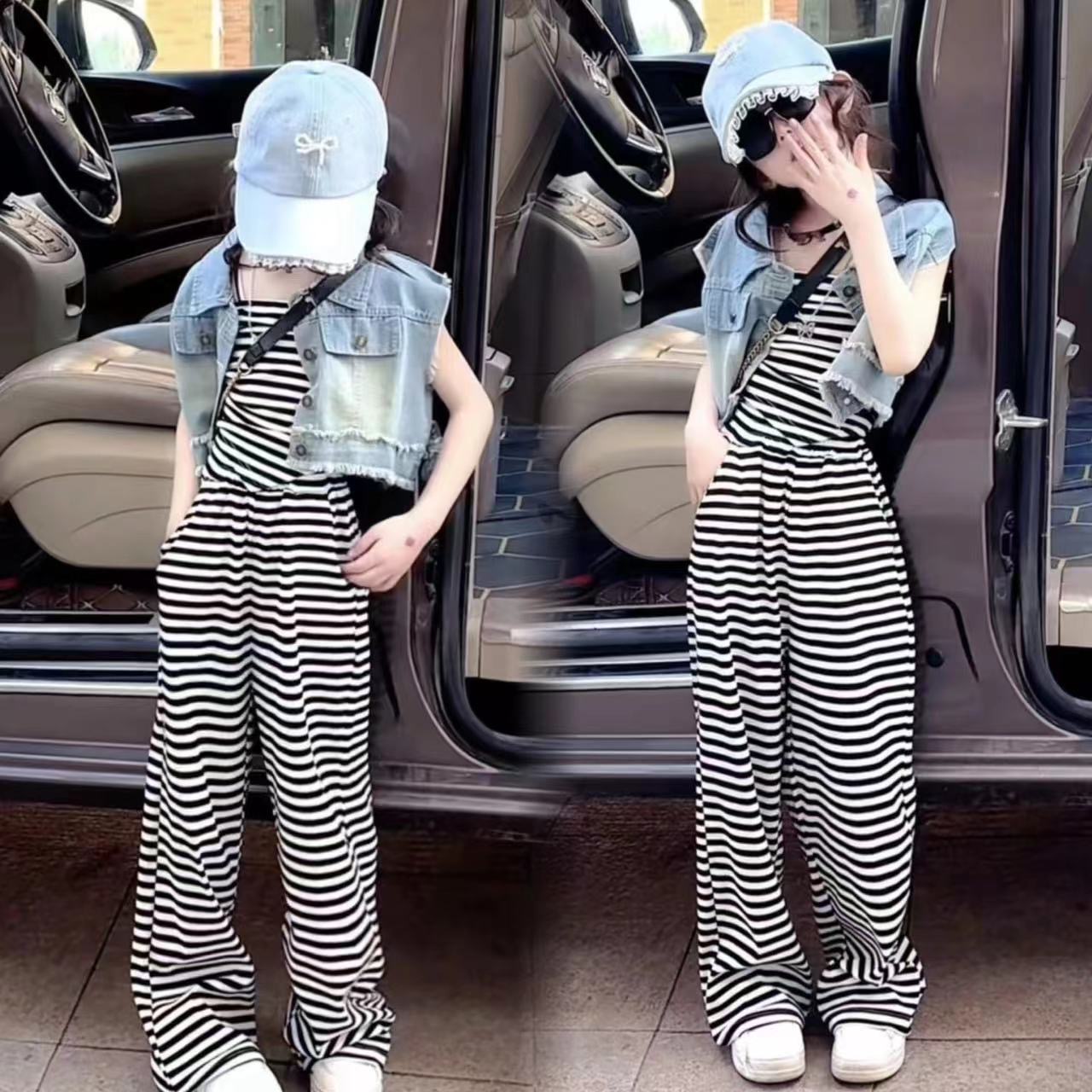Girls' summer set 2024 new fashion women's children's summer sling three-piece set striped net red explosion street