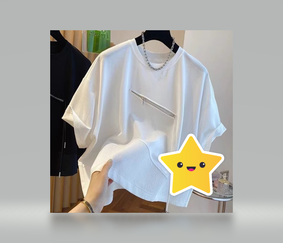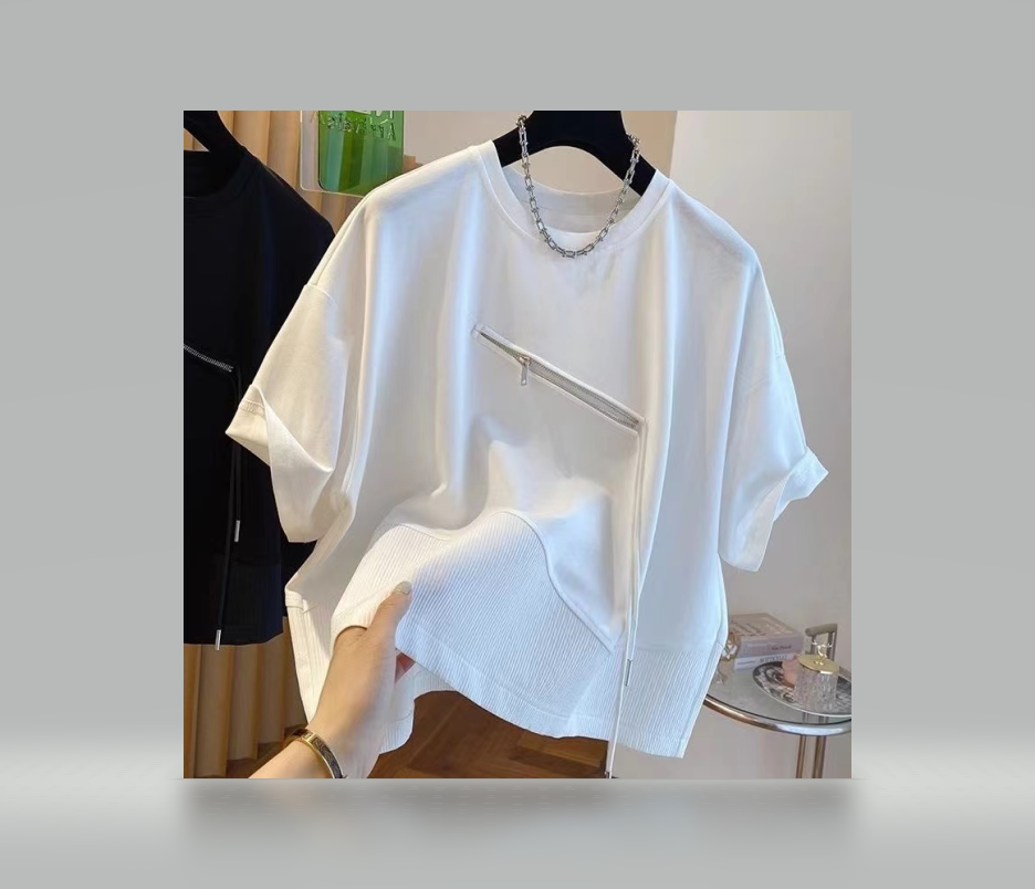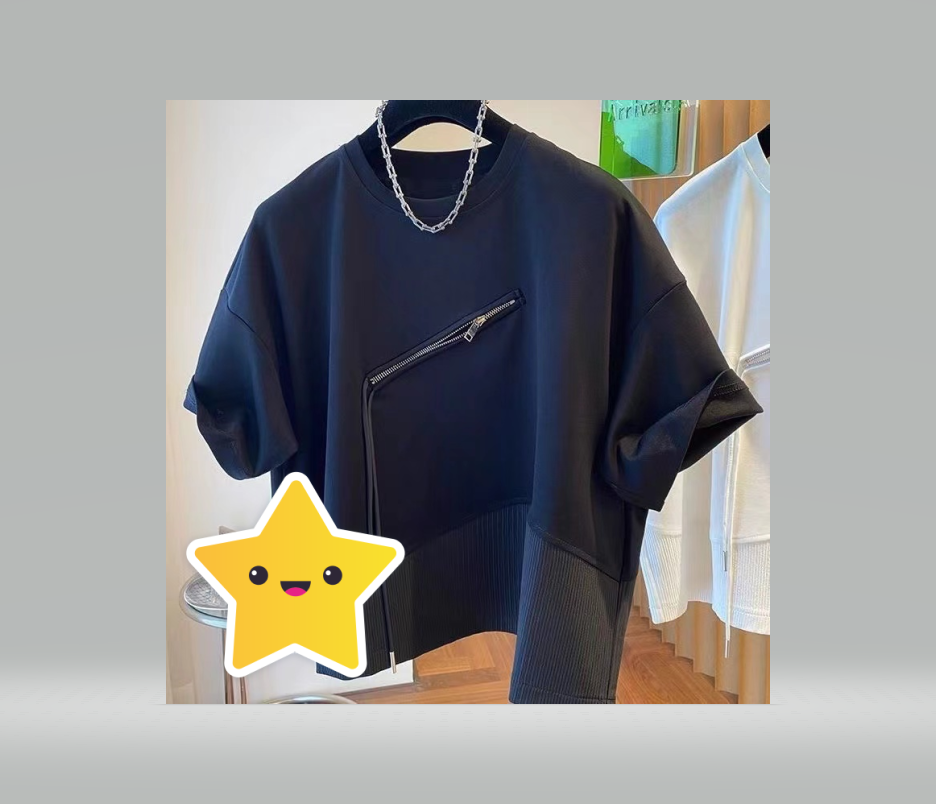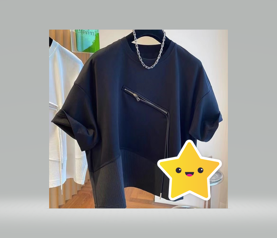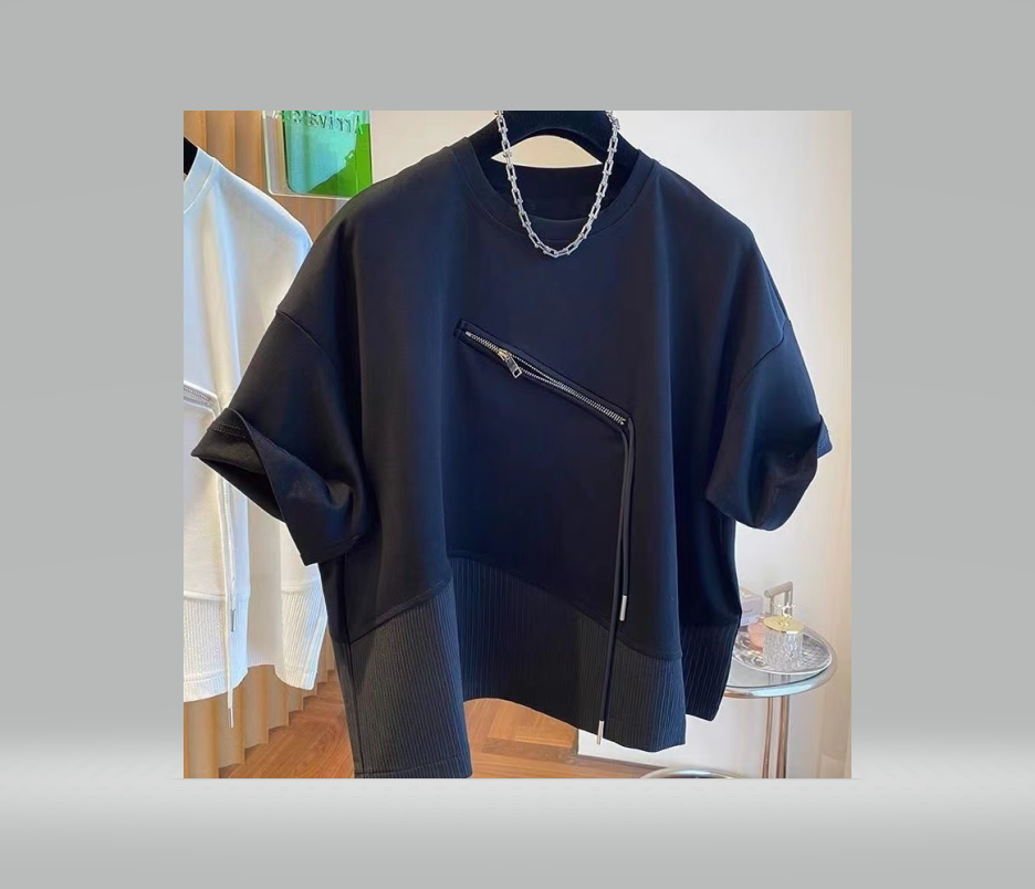 Large size 300 pounds summer irregular splicing small zipper design sense short-sleeved T-shirt men and women loose couple top