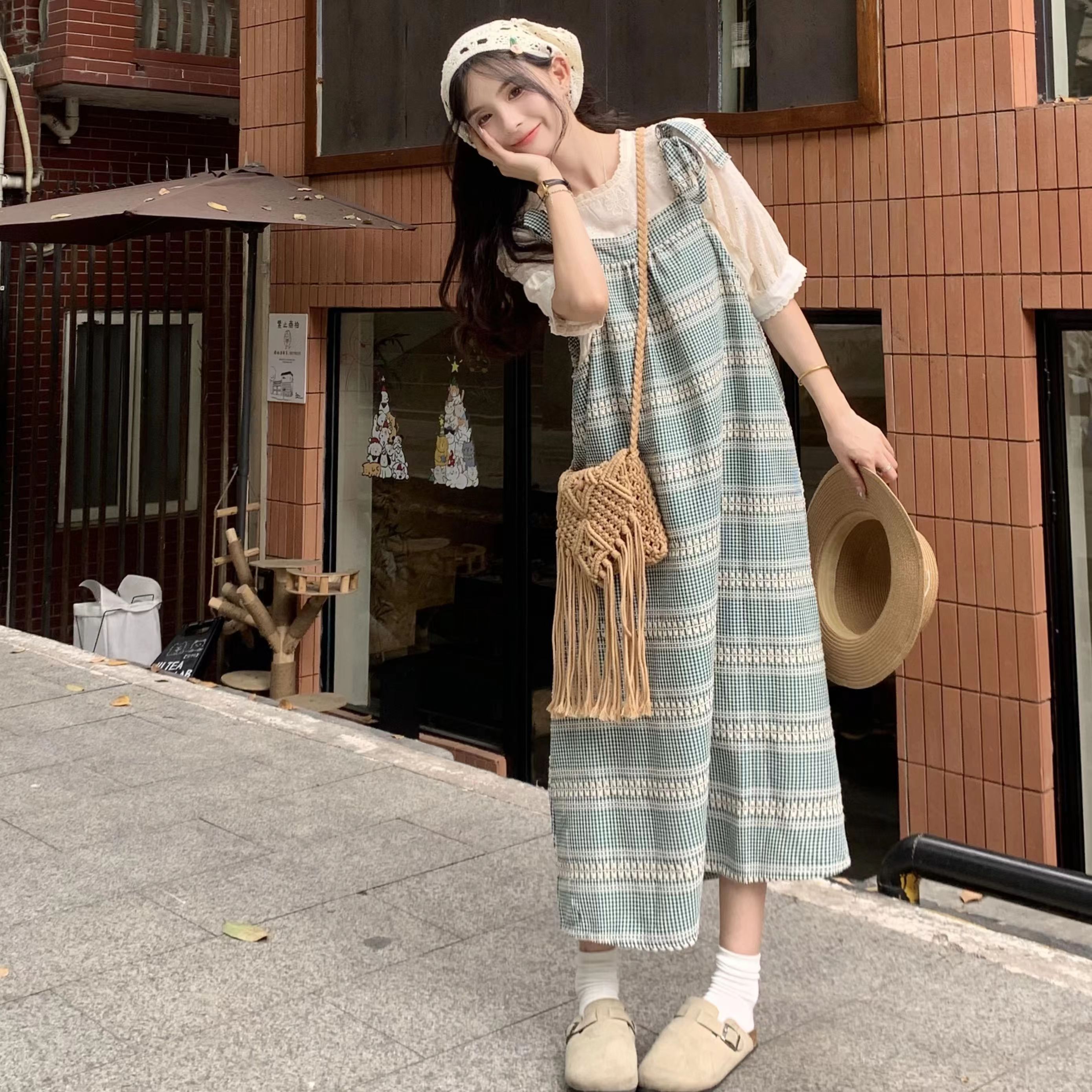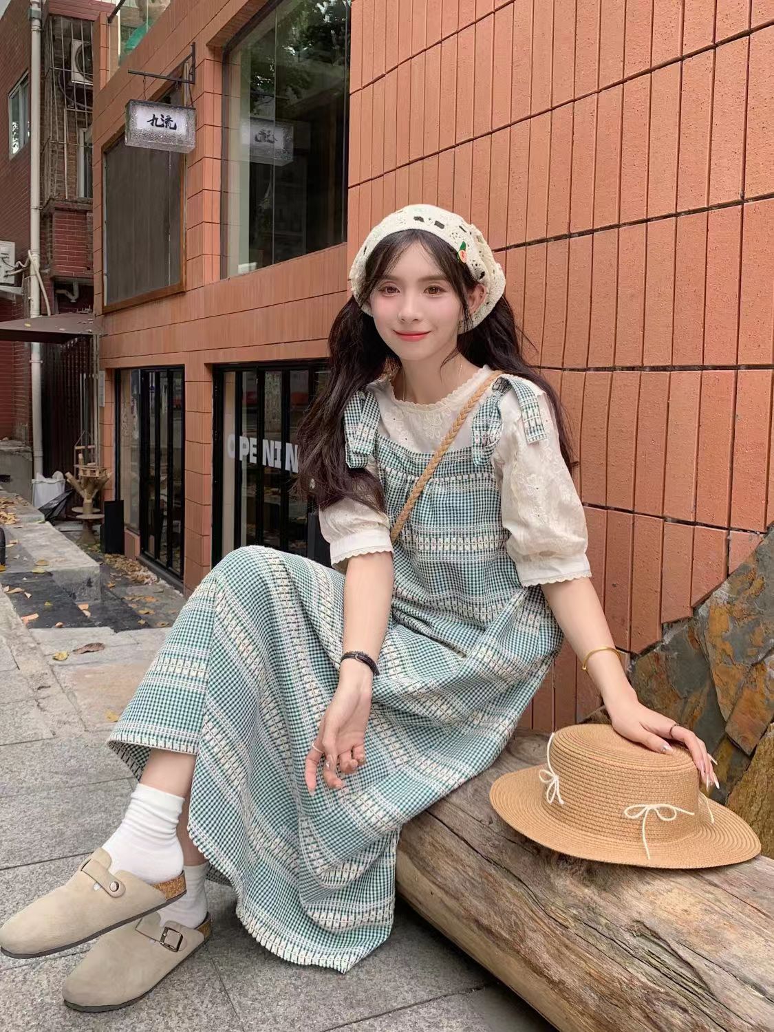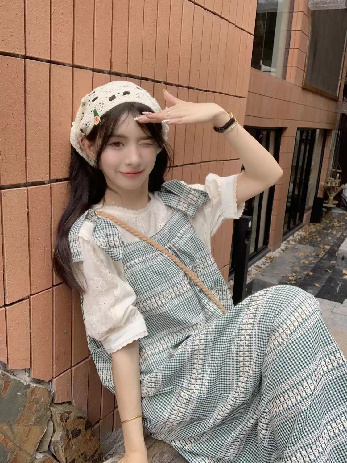 French sweet mori tie with folded halter dress women's two-piece summer lace short-sleeved blouse dress set