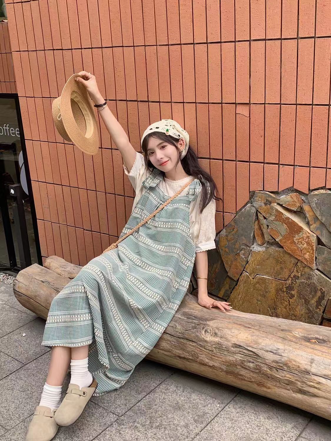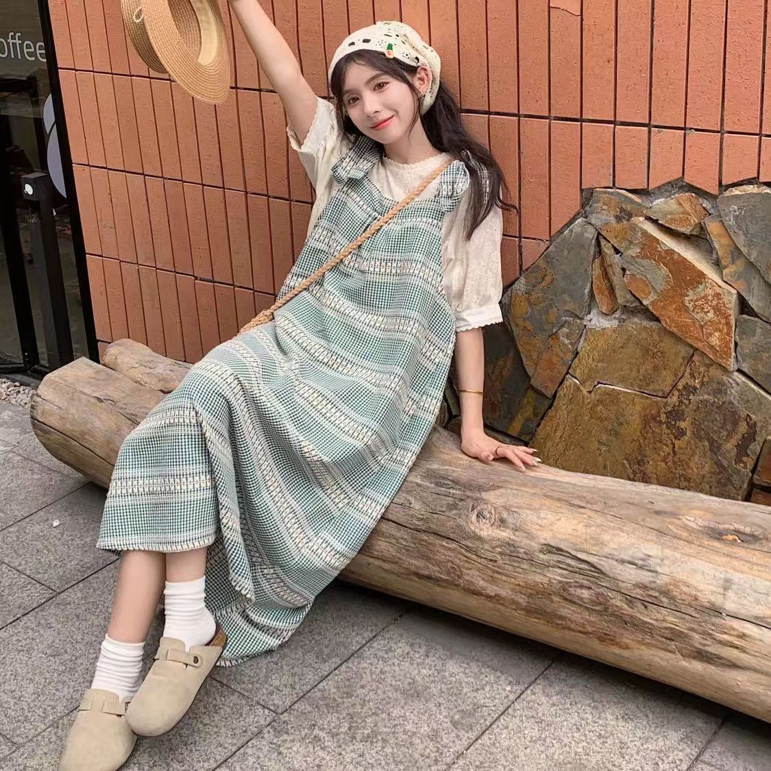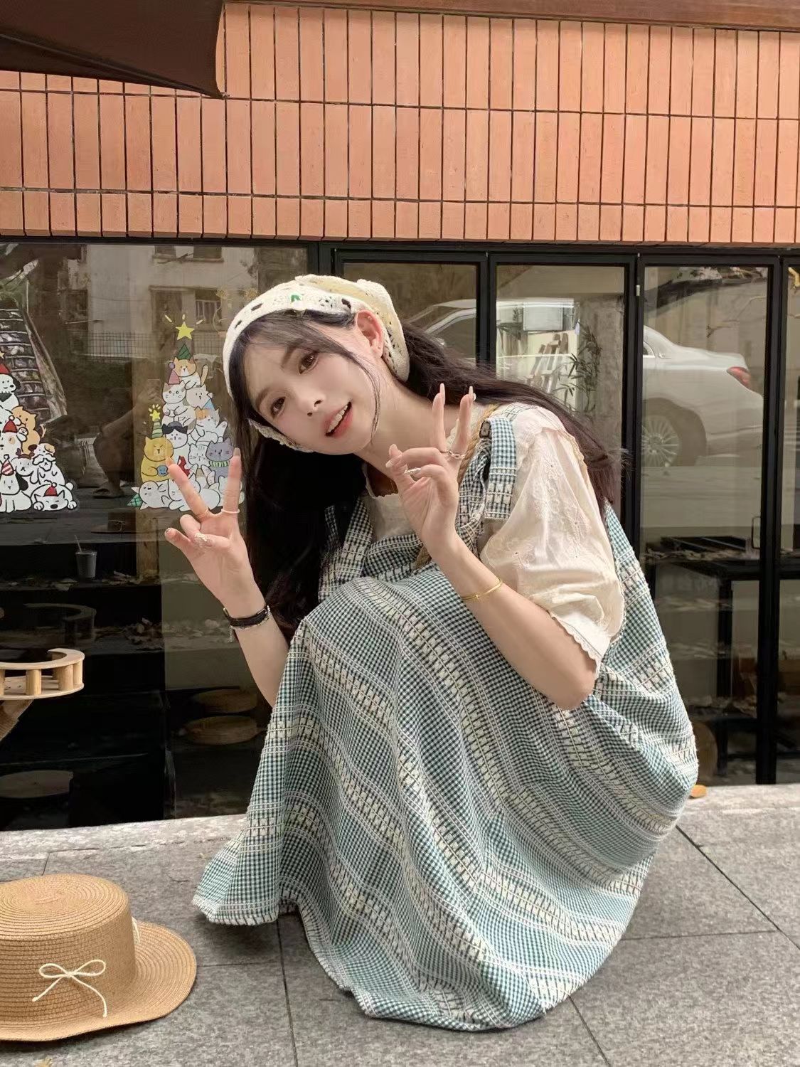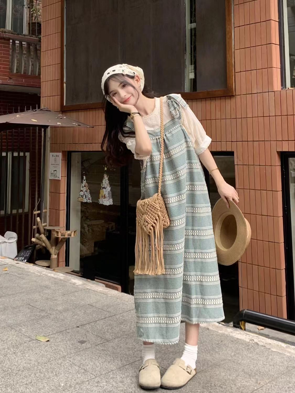 French sweet mori tie with folded halter dress women's two-piece summer lace short-sleeved blouse dress set