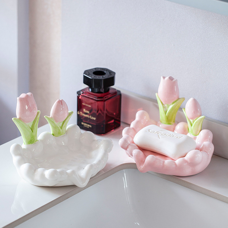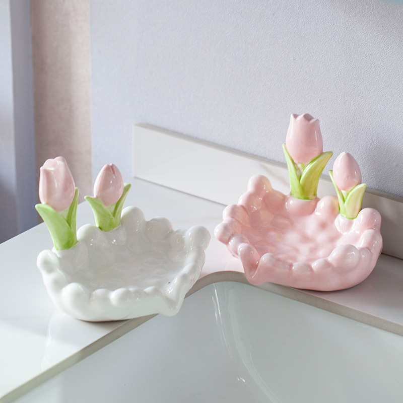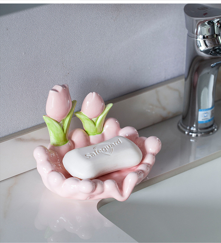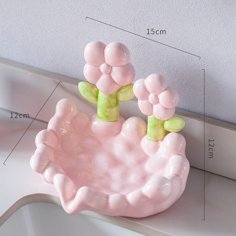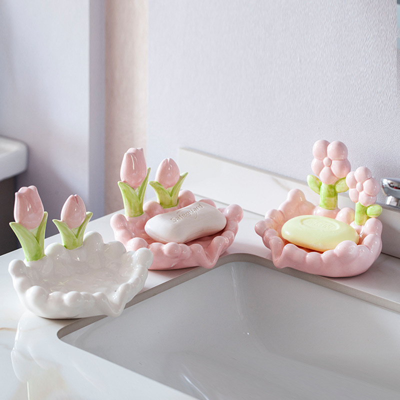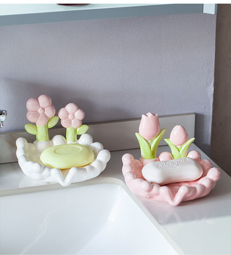 Home creative cute flower ceramic soap box free punch drain household soap drain sink storage rack