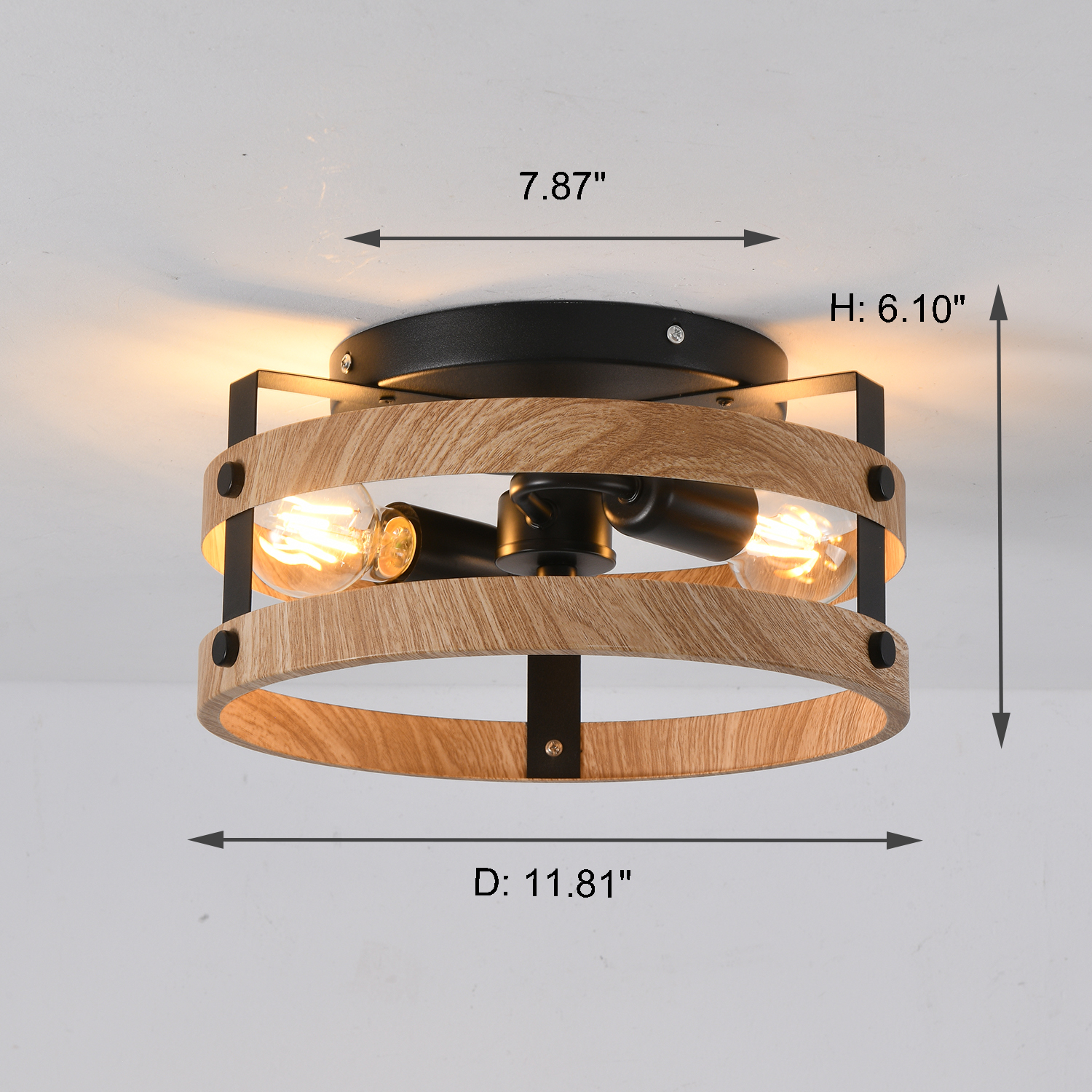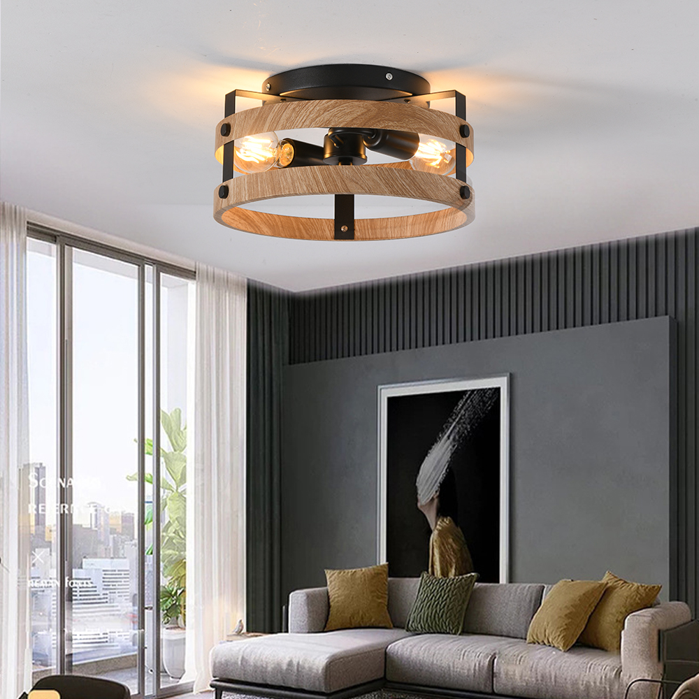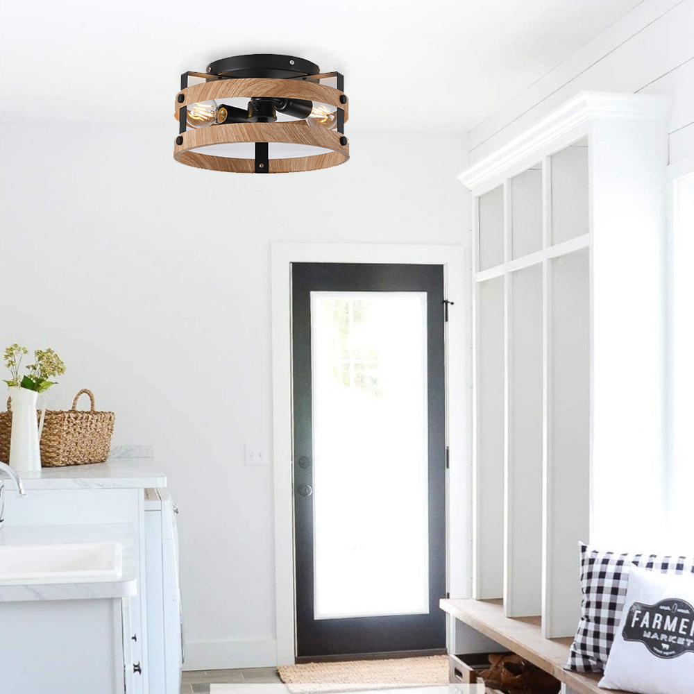 3-Light Rustic Flush Mount Light Fixture Wood Round Drum Semi Flush Mount Ceiling Light for Hallway Bedroom Kitchen Entryway Far