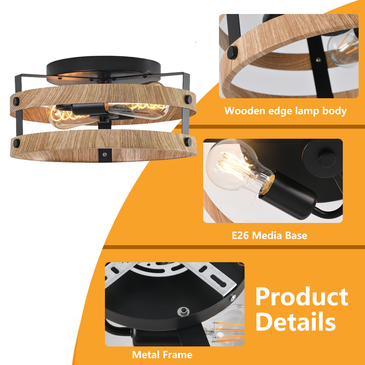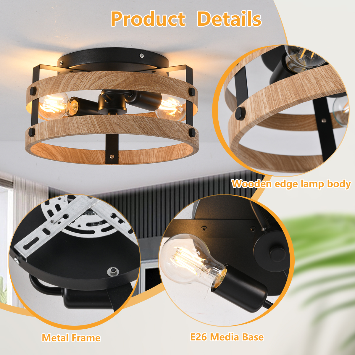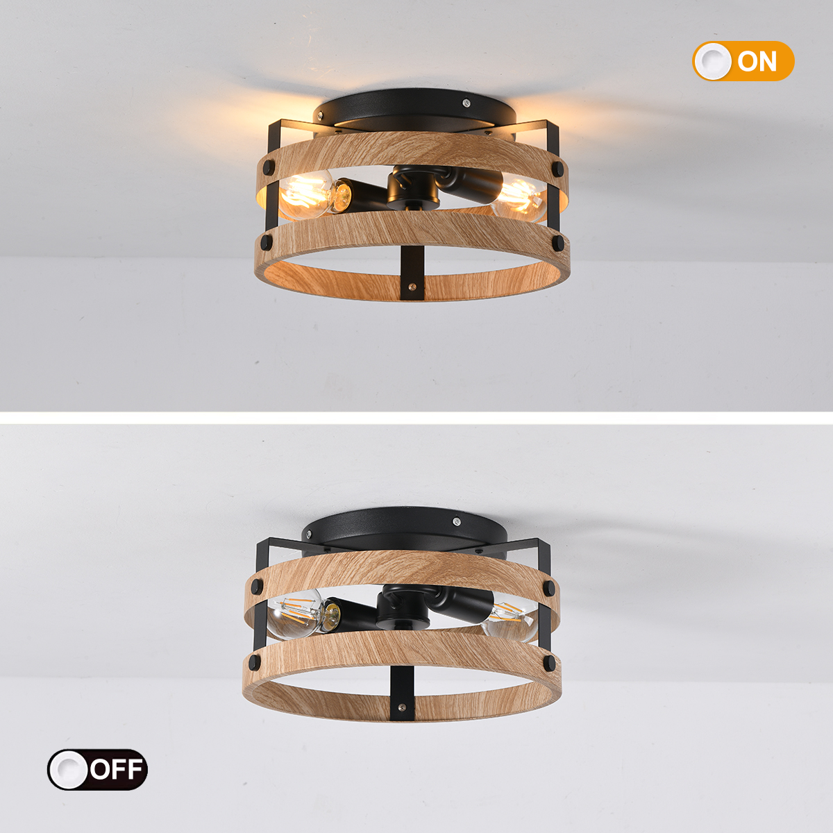 3-Light Rustic Flush Mount Light Fixture Wood Round Drum Semi Flush Mount Ceiling Light for Hallway Bedroom Kitchen Entryway Far