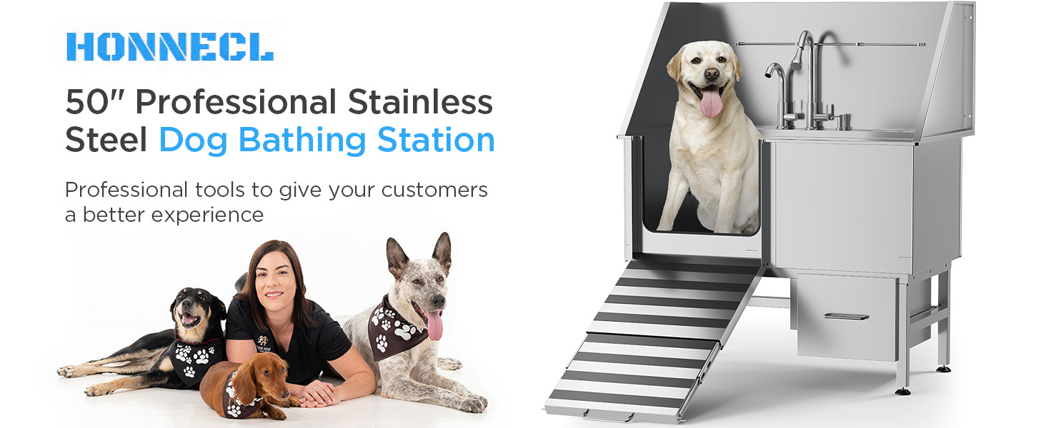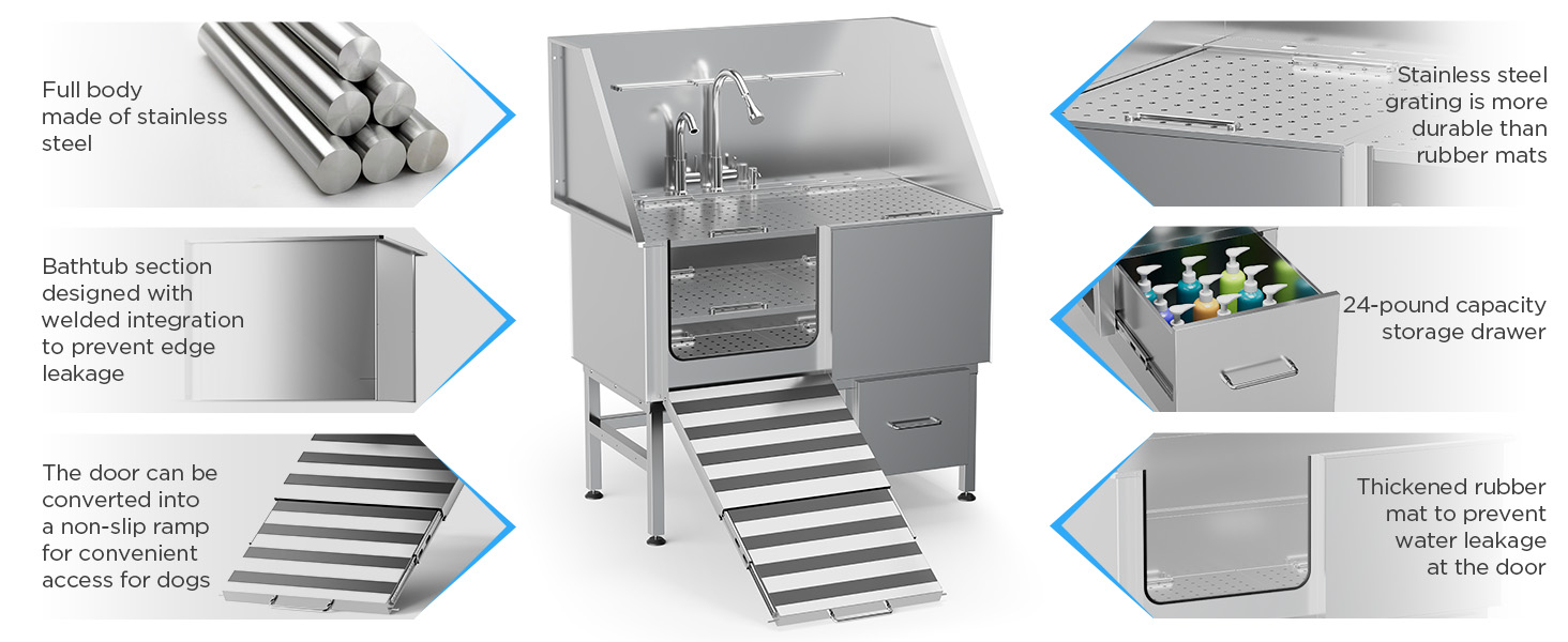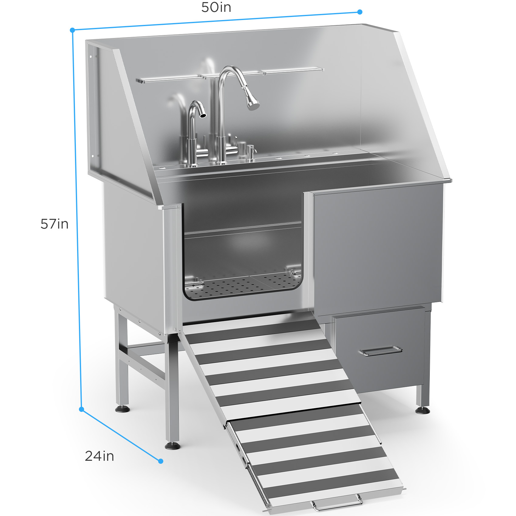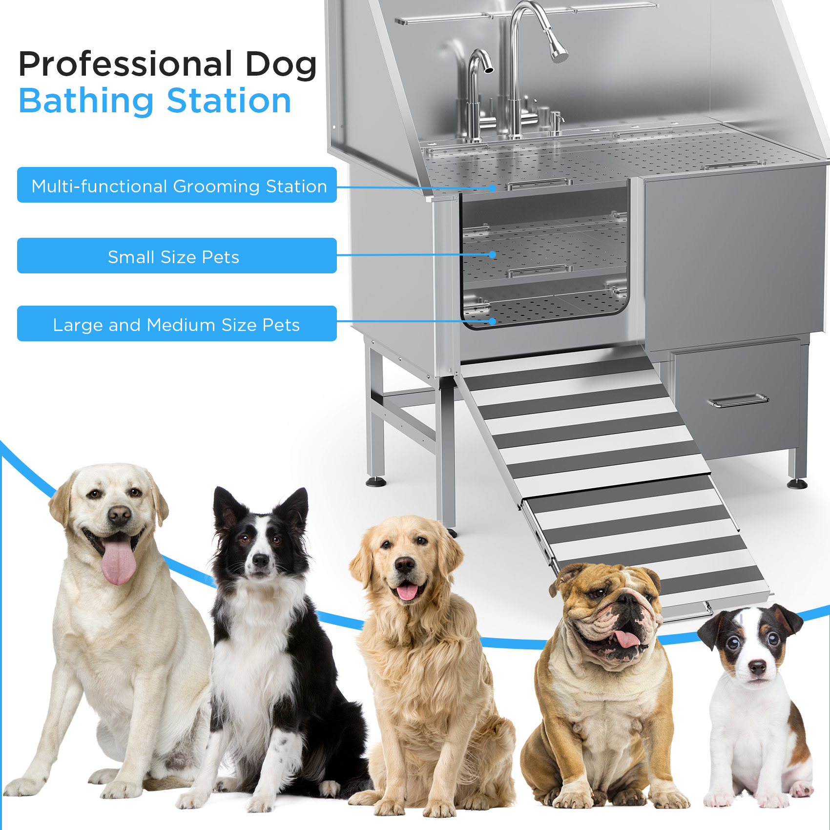 Professional Stainless Steel Dog Bathing Station - Dog Grooming Tub w/Ramp, Storage Drawer, Floor Grate & Faucet/Dog Bathtub for