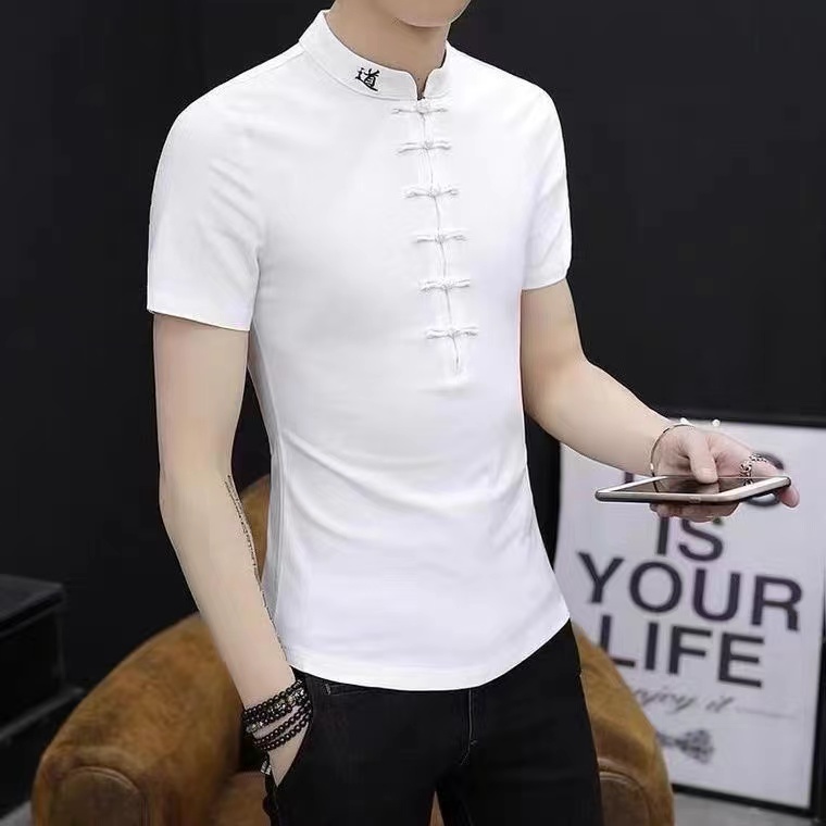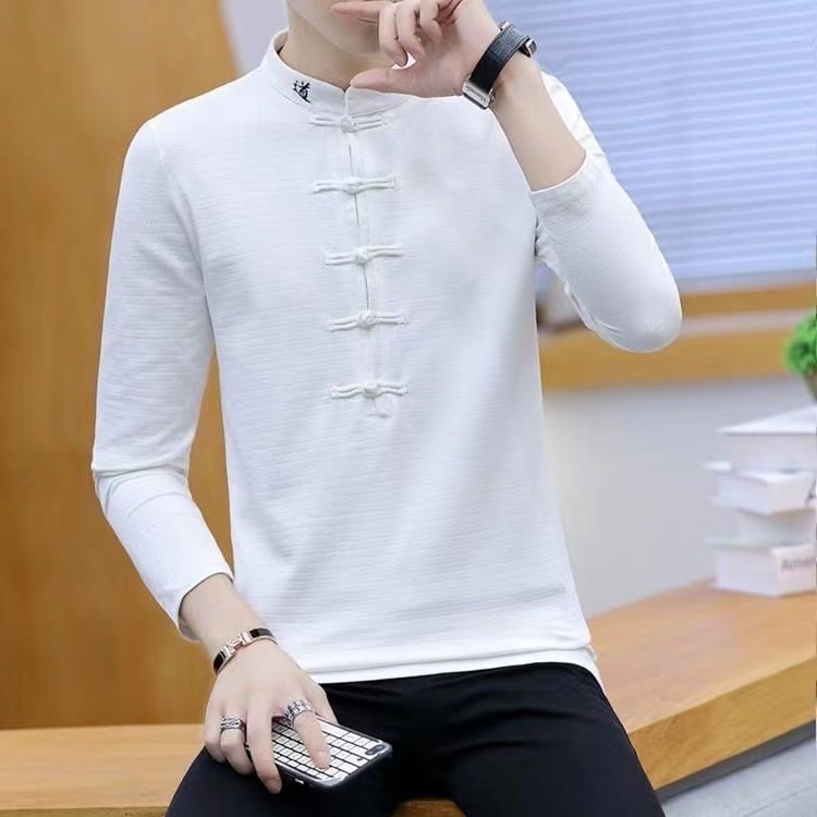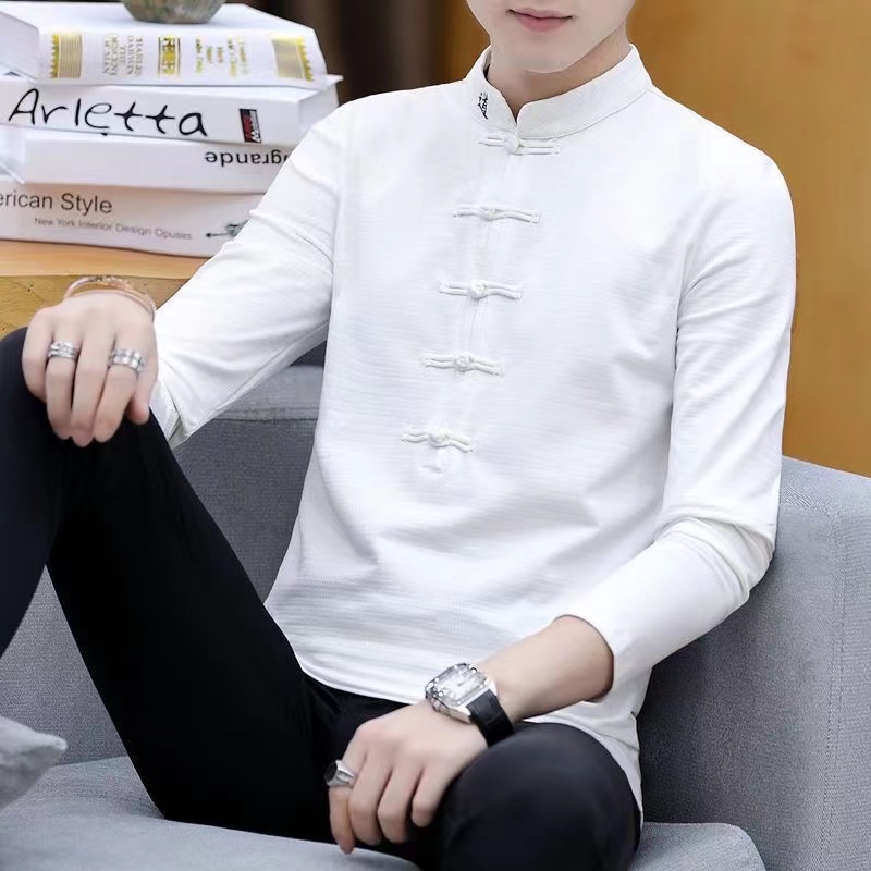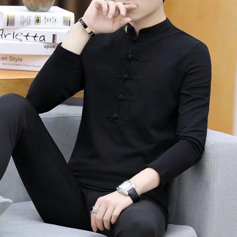Tang suit men long sleeve cotton linen T-shirt Chinese style retro disc buckle stand collar linen national style
