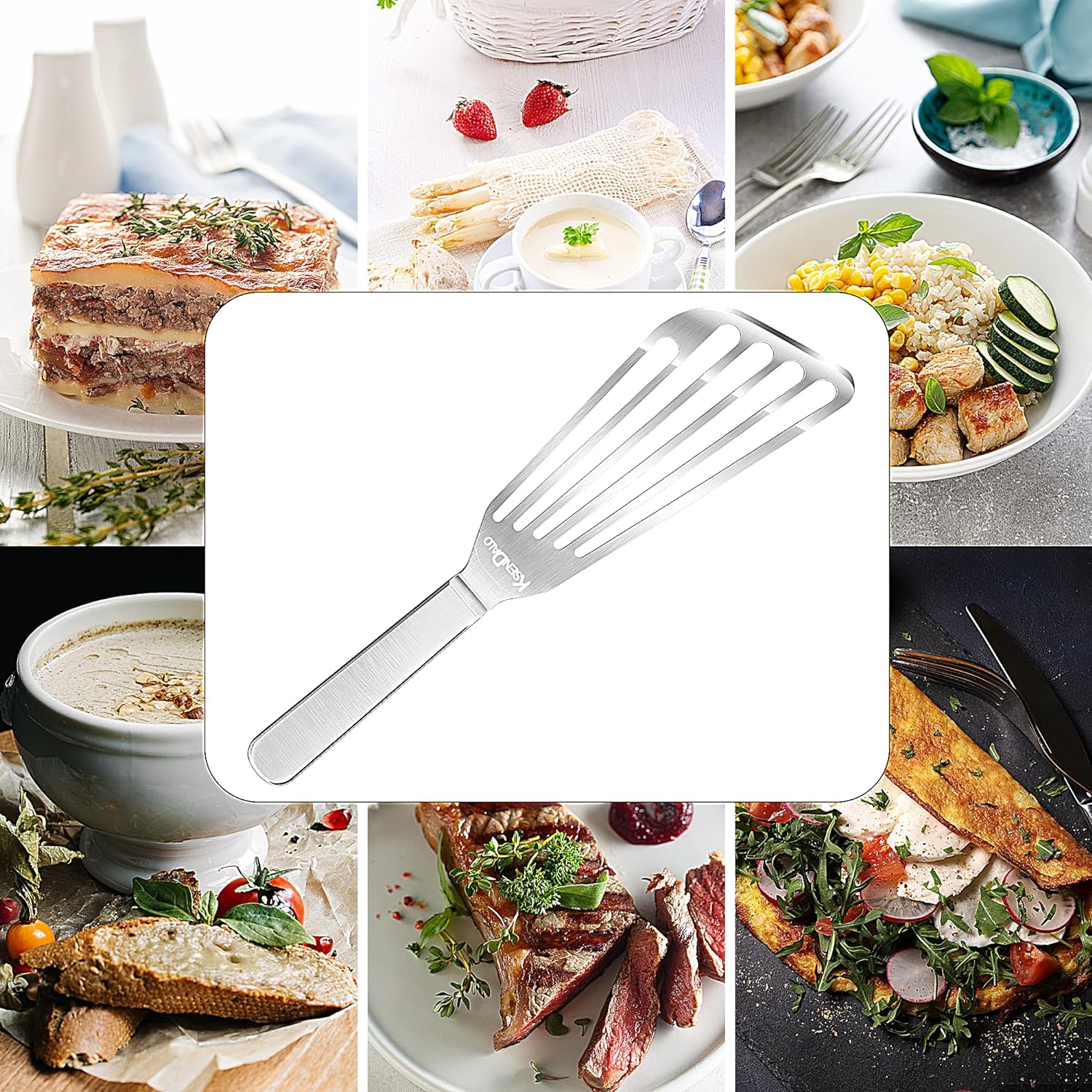 KSENDALO Fish Spatula Stainless Steel, 11.8inch Flexible Sturdy Thin Slotted Metal Spatula with Angled Blade, Silver