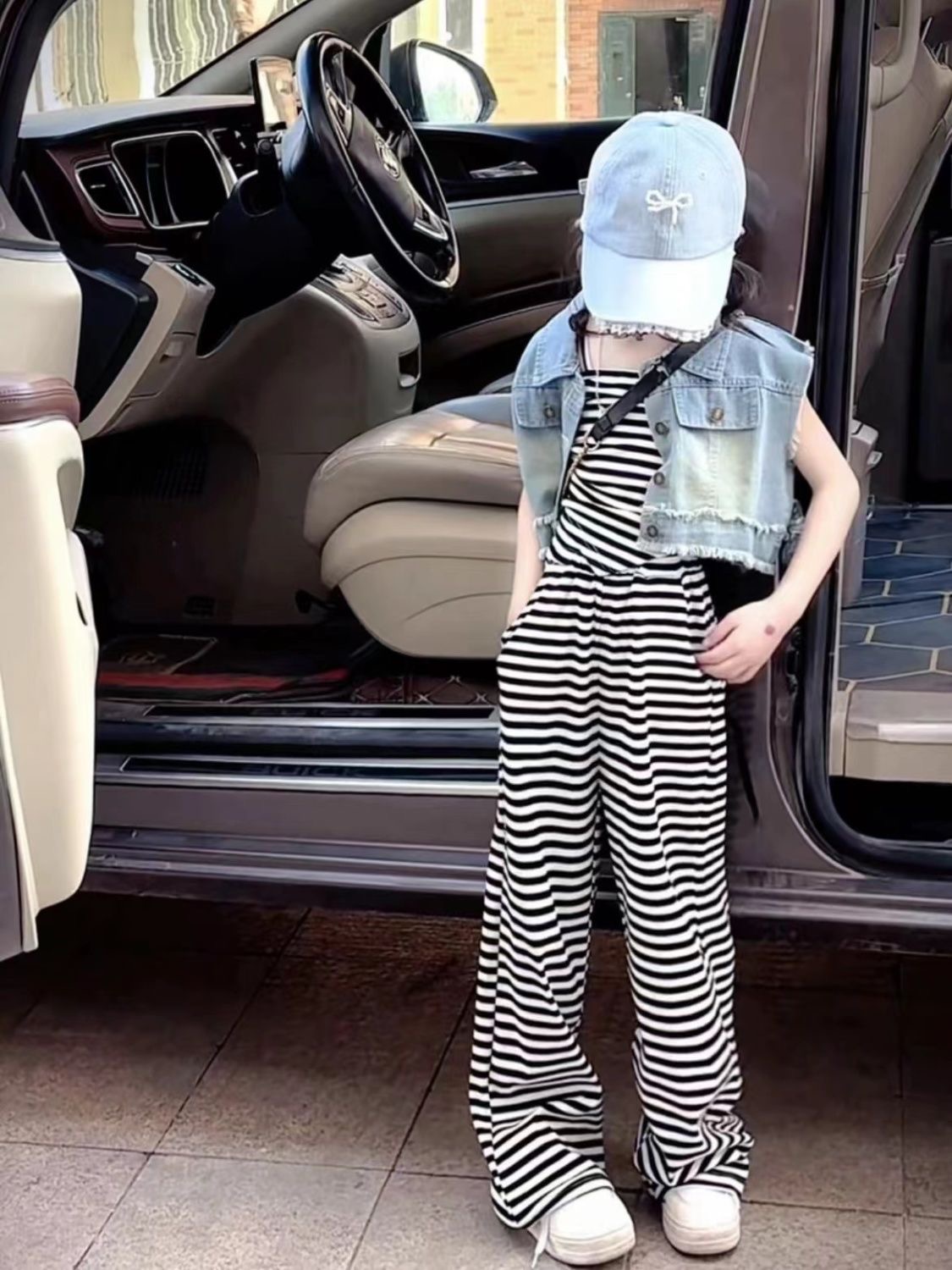 Girls' summer set 2024 new fashion women's children's summer sling three-piece set striped net red explosion street