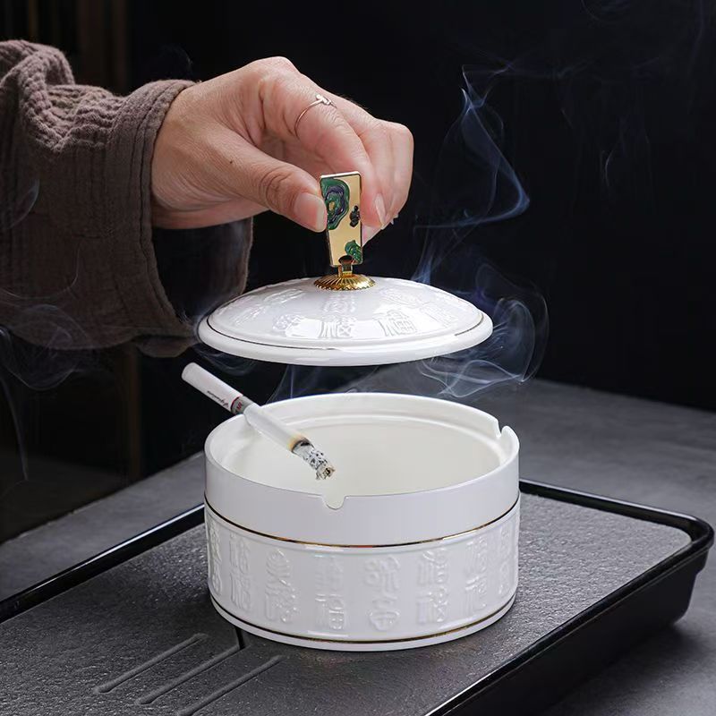 Sheep fat jade ashtray high-grade gold with cover windproof fly ash household living room office decoration ceramic ashtray
